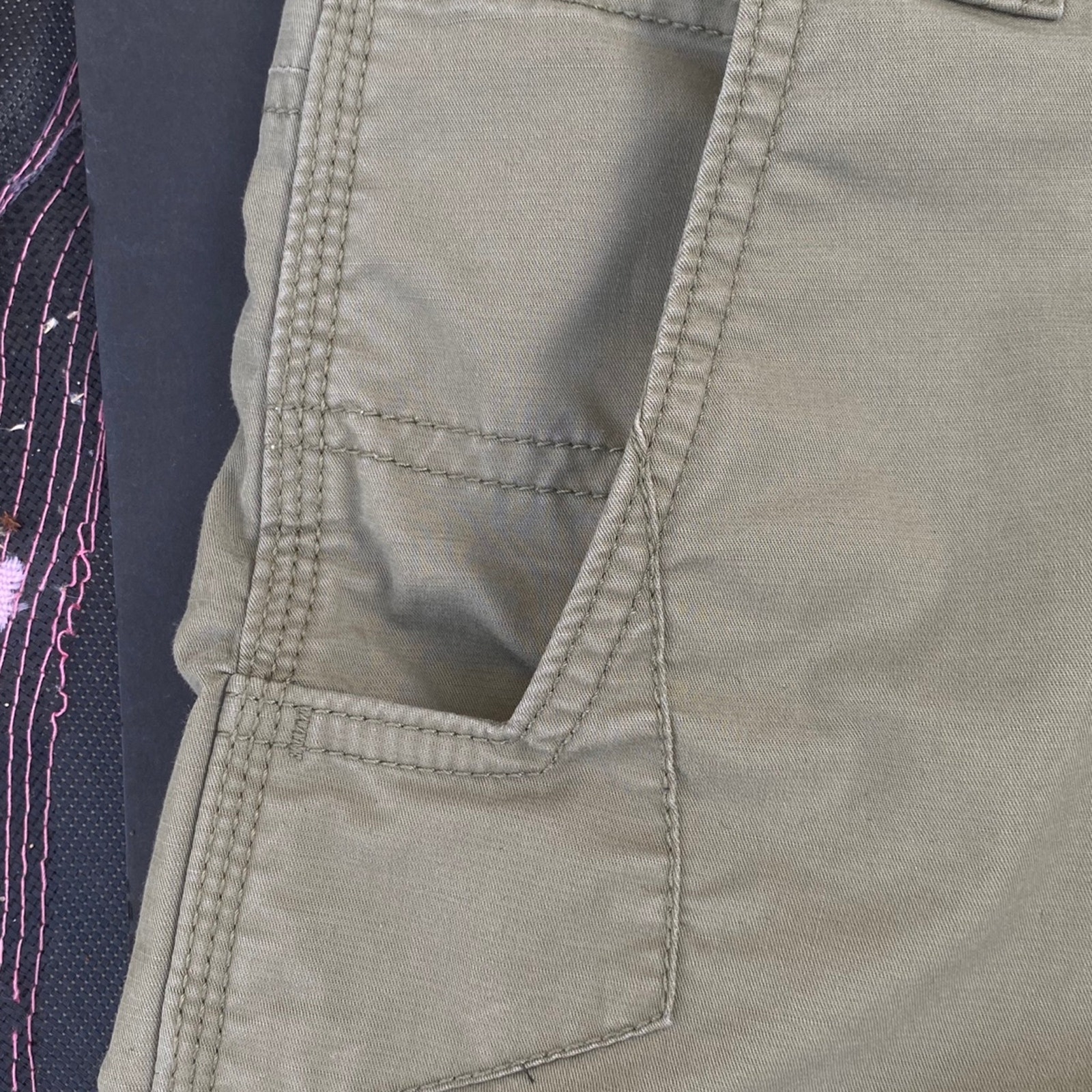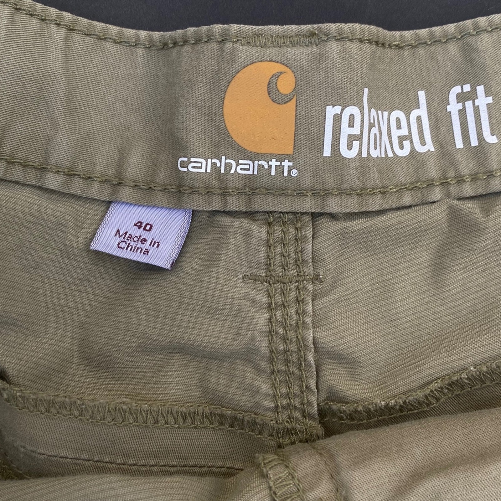 Preowned Used Carhartt Khaki Green Men's Size 40 Zip Pockets Button Closure Casual Shorts. Cotton Blend, Length 10. These are in good condition with no rips or tears. Lots of life left. Perfect for outdoors.