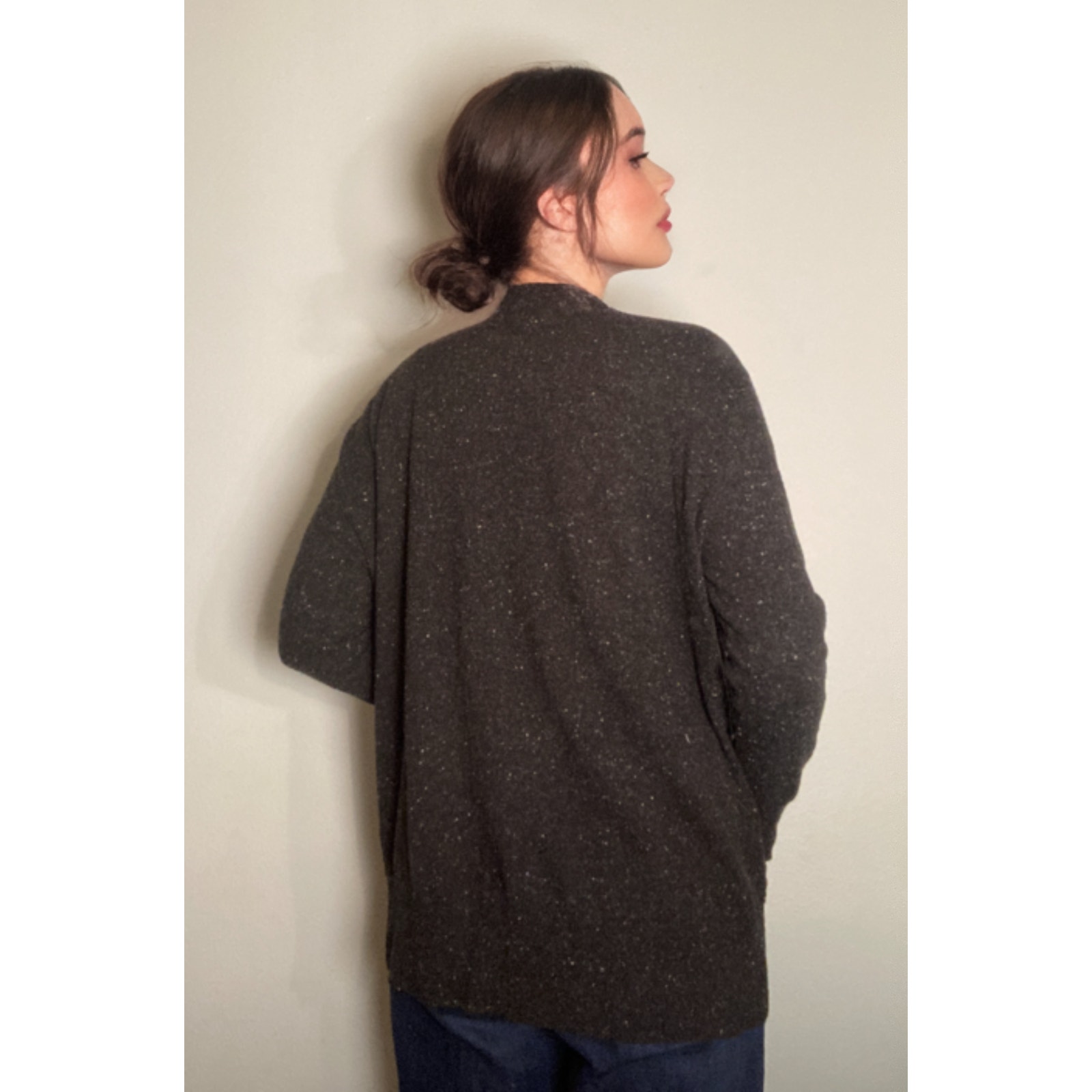 This COS black speckled wool blend cardigan is the epitome of laid-back, effortlessly cool style. With its minimalist design and subtle speckled texture, it offers a modern twist on a classic wardrobe staple. Perfect for layering, this cardigan features a cozy fit that works for men's size S or women's size M/L, making it versatile and unisex. Its premium wool blend ensures warmth and comfort, ideal for transitional seasons or cool evenings. Channel understated sophistication with this timeless piece that's perfect for casual outings or a relaxed office look.