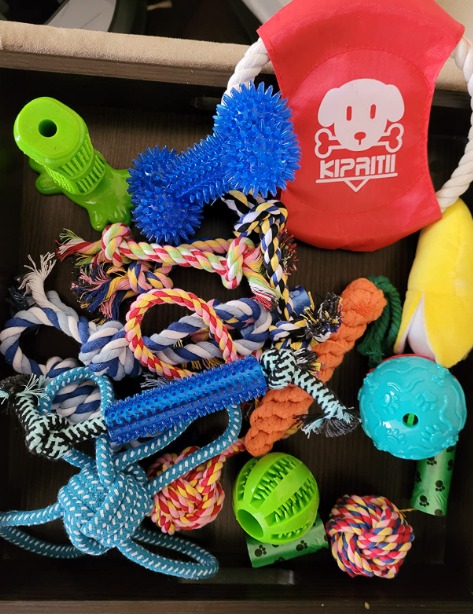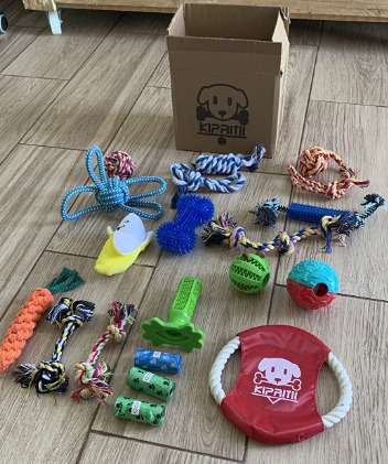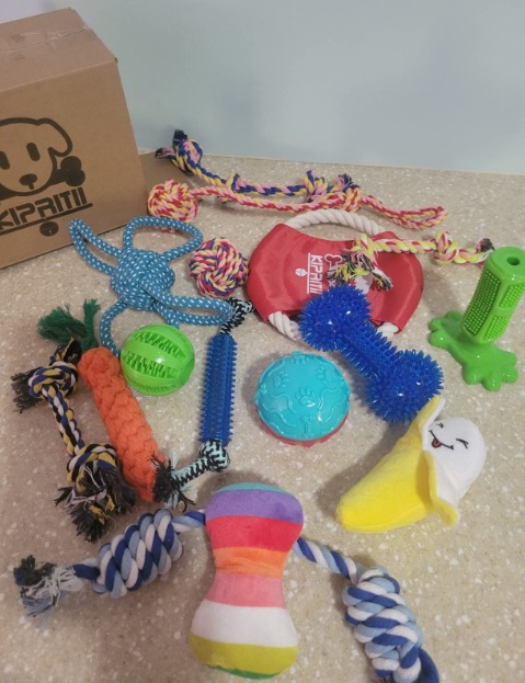 Dog Toy & Super Fun: 20 Pack pet toys for dogs, great for puppy and small dogs. Includes 9 rope dog toys, 2 dog treat balls, 1 rubber dog toothbrush stick, 1 banana dog toy, 1 squeaky plush toys, 1 rubber toys, 1flying disc dog toy and 3 extra dog bag rolls & 1 bag dispenser as a gift. You are not merely buying puppy toys, but helping him stays happy and healthy.