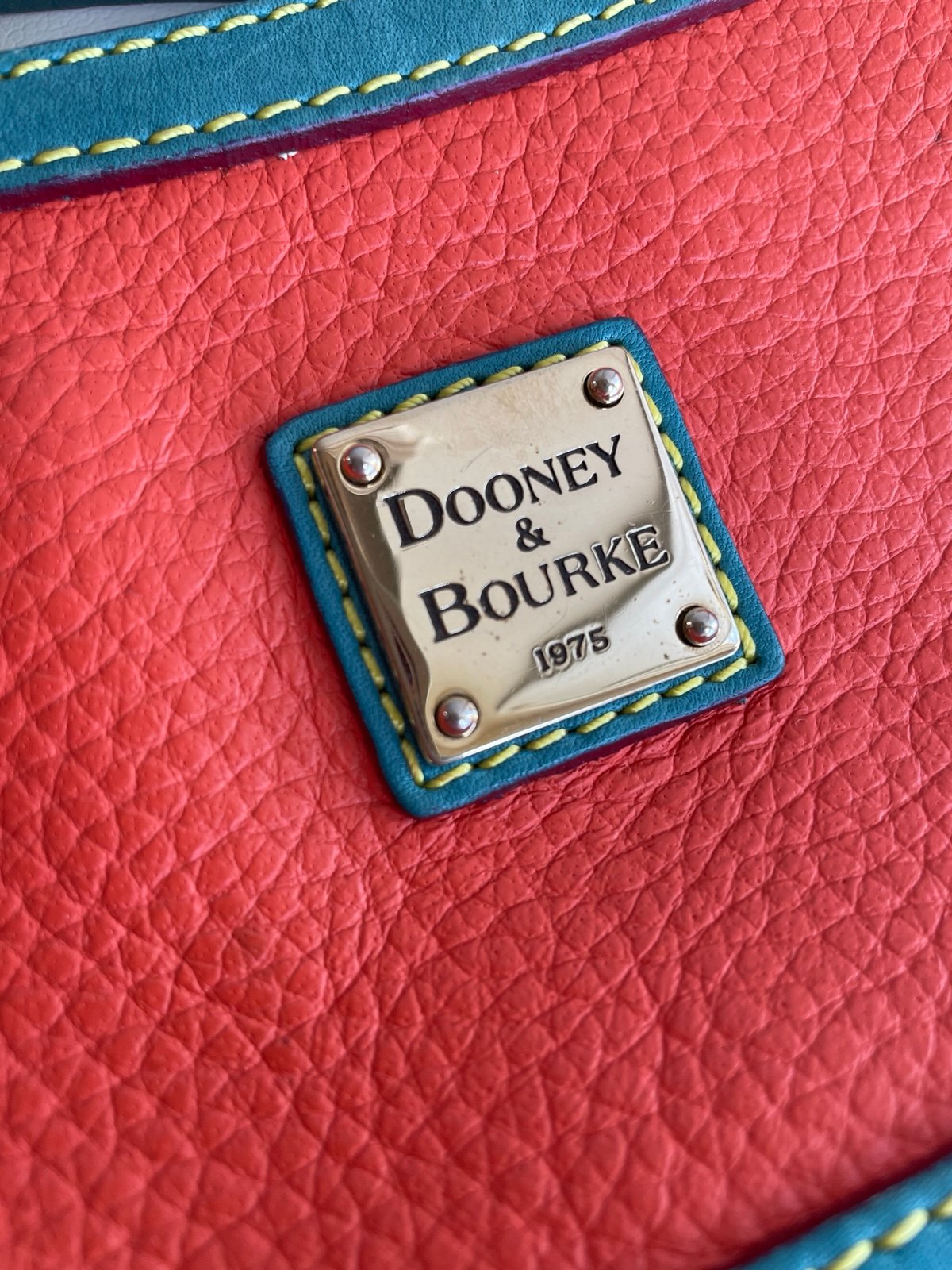 Defects: this bag has been used and shows some wear. Please see all photos. Interior Dooney fabric tag has been partially cut. Key clip leather is slightly dirty on sueded underside. Gold hardware shows some nicks. Very small black dot near top on back. Bottom shows a little dirt. Teal trim on sides has some scuffing.