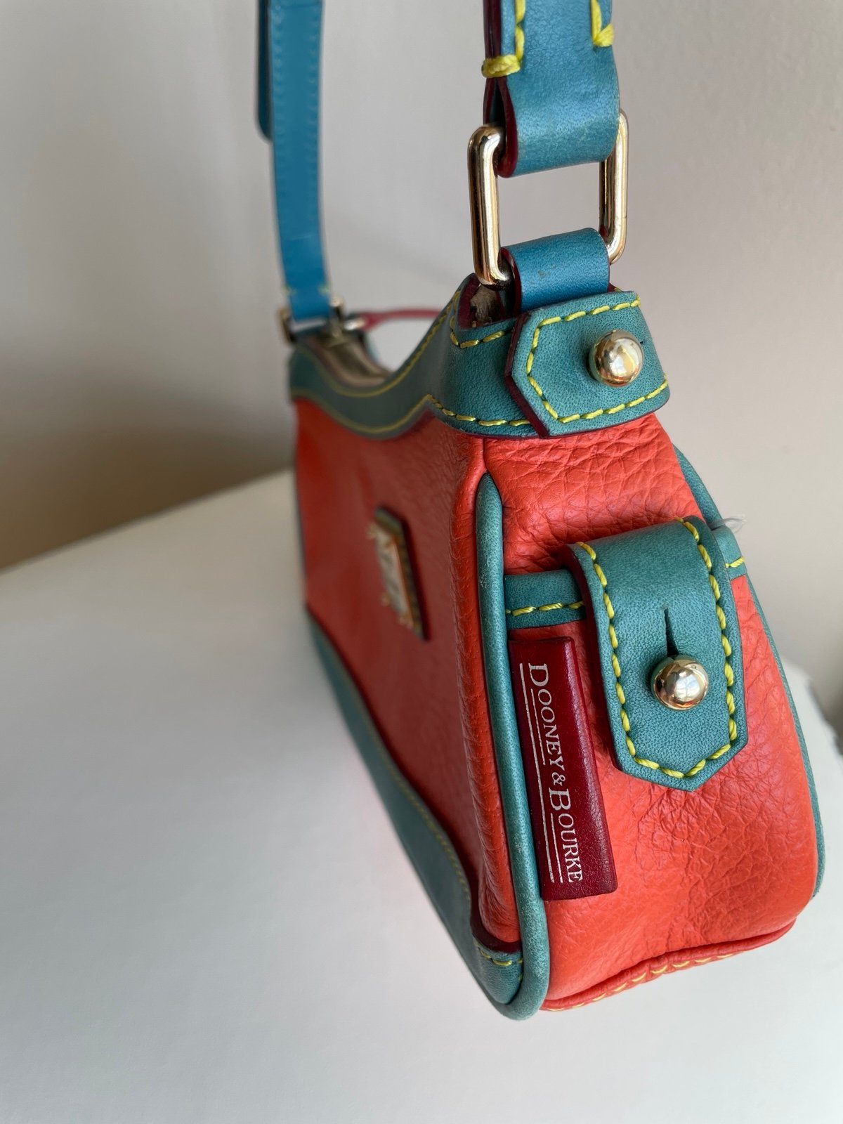 Rare vintage mini zip top baguette bag in orange pebble leather with contrasting smooth teal leather trim. Red leather Dooney & Bourke logo tag sewn on one side. Gold hardware and yellow stitching. Adjustable shoulder strap.