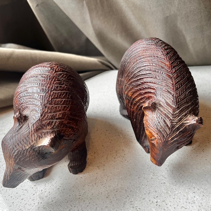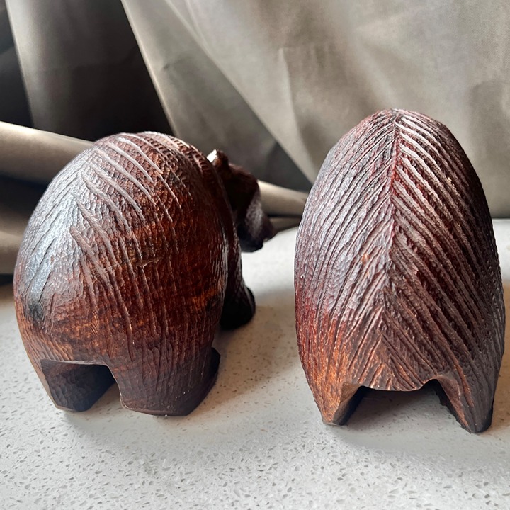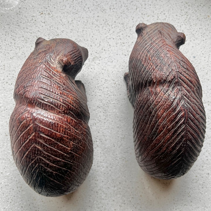 These intricately hand-carved bear figurines exhibit fine craftsmanship and attention to detail, creating an elegant addition to any collection or decorative display. Their natural wooden finish highlights the texture and form, providing a rustic yet sophisticated charm.